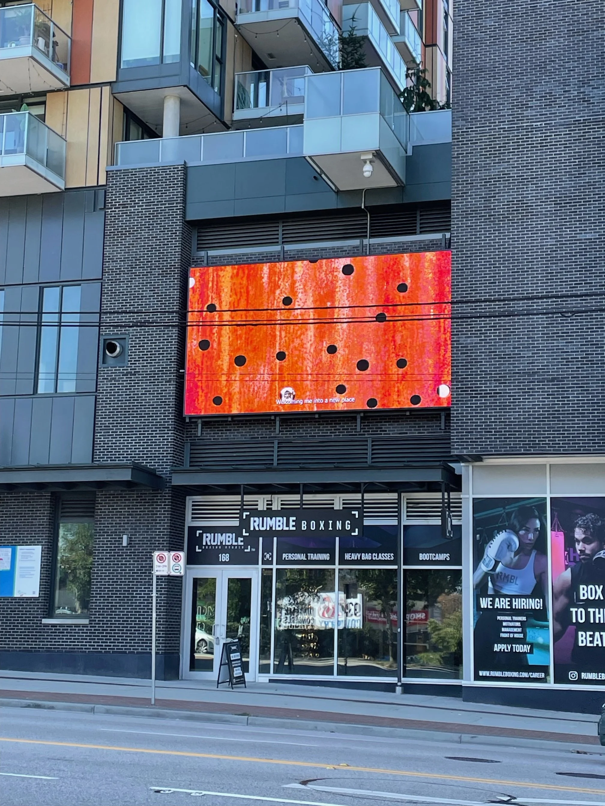 Students were honoured to have their work featured on a busy street corner at East Broadway and Kingsway in East Vancouver in a daily looping screening program for over a year. This screen is programed by grunt gallery, one of the city’s oldest artist-run centres. A kick off celebration and presentation by Fiona Tinwei Lam about the project and screening program took place in April 2024.