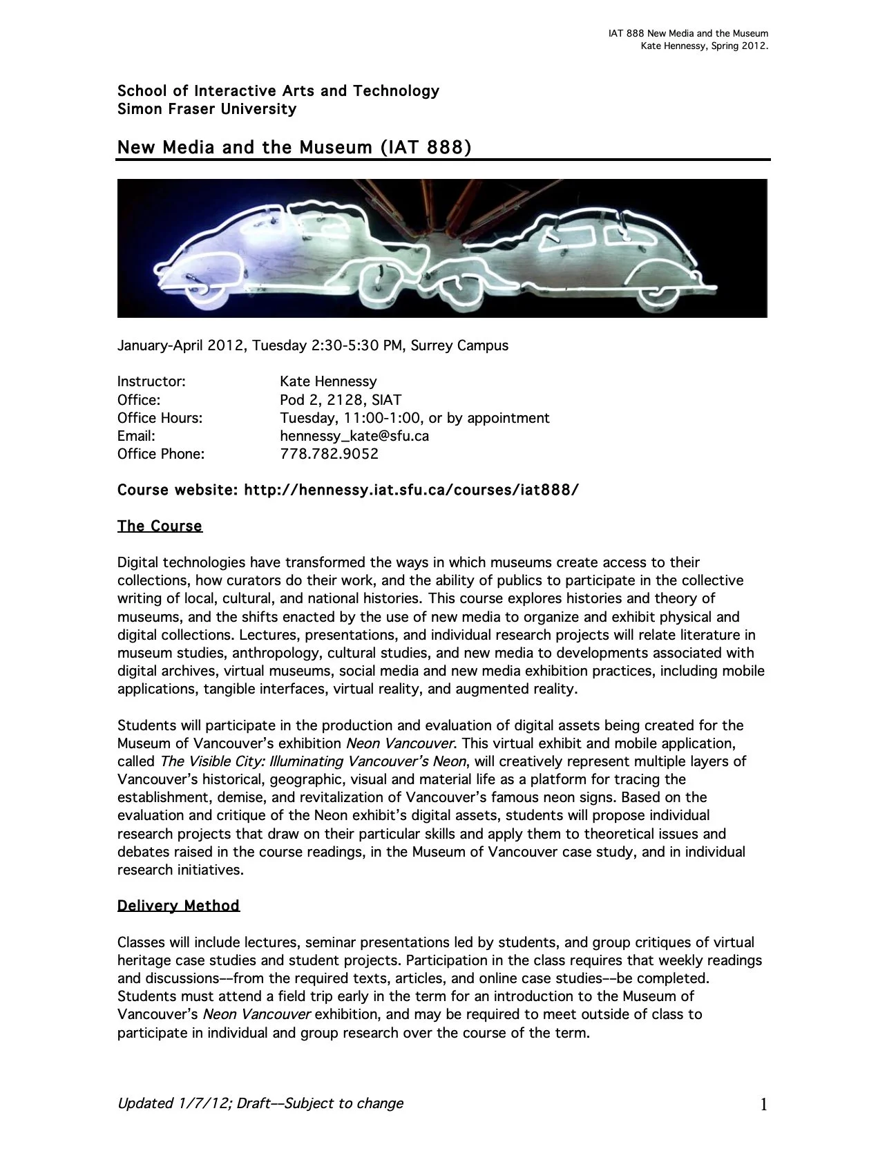While I only had the opportunity to teach this course once, it was central in creating a teaching collaboration with the Museum of Vancouver that still continues. I learned how to organize curriculum with curators, and find ways to bring students’ work into the museum—in this case, final research papers were presented conference-style in a public event at the Museum of Vancouver at the end of the semester as public programming associated with the Neon Vancouver exhibit and their geolocative app.
