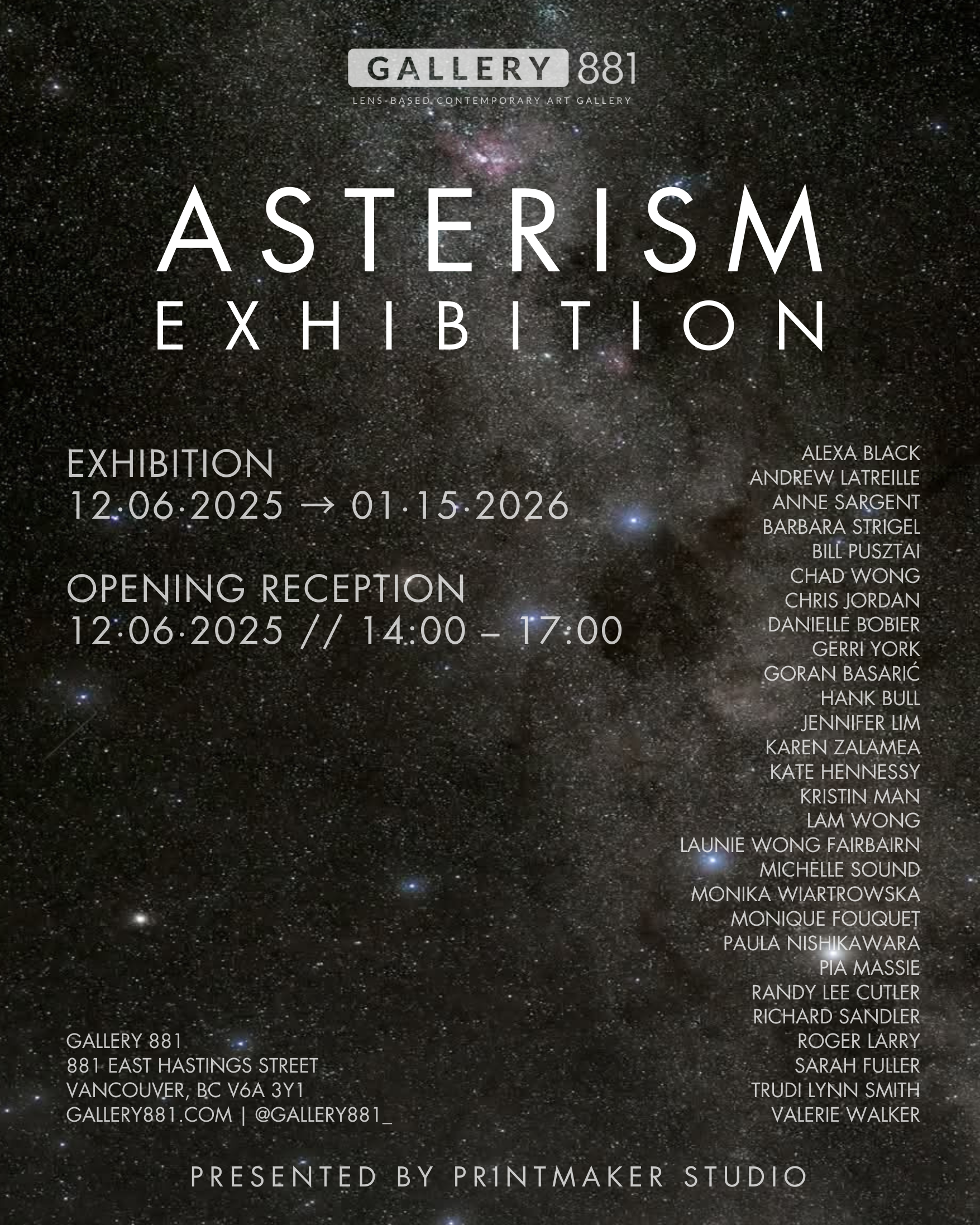 Asterism celebrates this moment of reunion and renewal: a temporary gathering of voices that illuminates the breadth, depth, and possibility of lens-based art at Gallery 881.